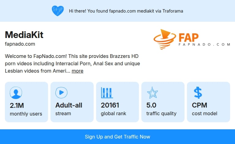 Still, if your site needs sales and you do not mind a cut, Fapnado can help. The site has worked for almost 20 years. They can give a lot to your site. You can ship an email for more additional info, and they answer, but it feels a bit messy.