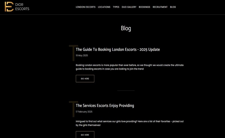 The blog looks good. It uses black, gold, and gray. This style fits with the fancy look of the escorts. The logo of Dior Escorts is at the top, with the website menu to help you find what you need.